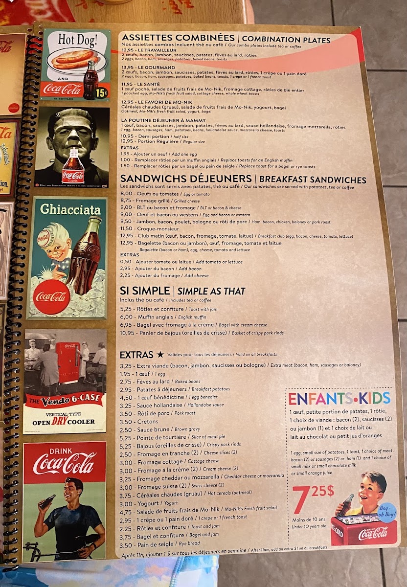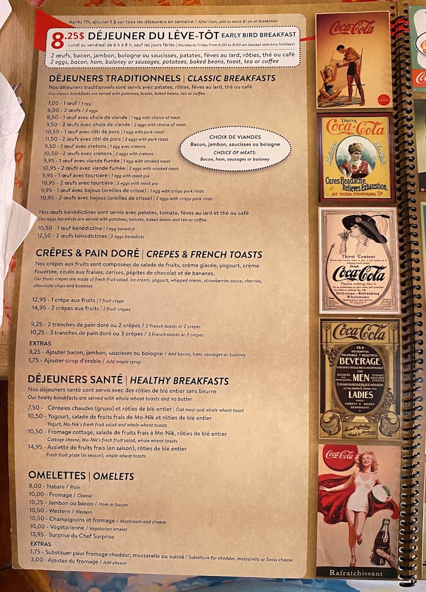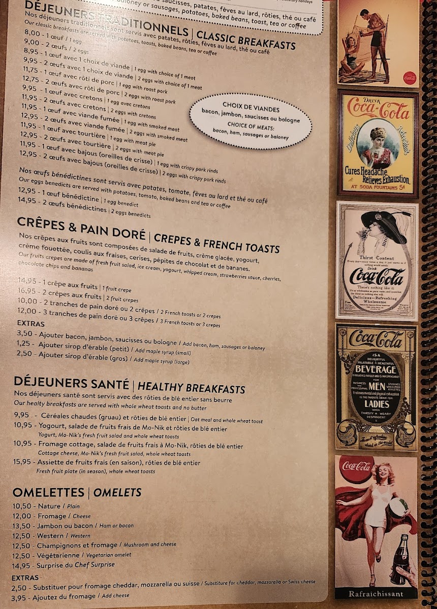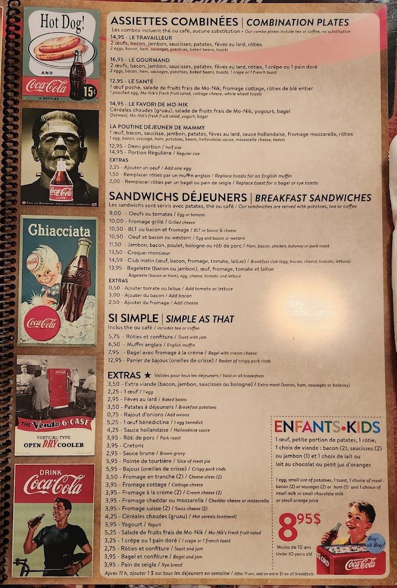 Get ready to tantalize your taste buds with our mouthwatering specialties at Resto Chez Mo-Nik. From the classic Eggs Benedict to the savory Benediction, you'll find a wide array of options to satisfy your cravings. Indulge in our delectable Fruit Pancakes or try the flavorful Benedict Florentine for a true culinary experience. If you're looking for something more hearty, don't miss out on our Bagelette or the 4.99 breakfast special - One Egg Scrambled with Sausage and Bacon, Beans, Toast, Potatoes, and Coffee on the side. Feeling adventurous? Try our unique dishes like the Crêpe Aux Fruits, Assiette Blt, or the Club Sandwich Avec Oeuf. And for the little ones, we have special treats like the Crêpes Mikeymouse. Come visit us at 33 Boulevard Saint-Joseph in Gatineau, Quebec, and treat yourself to a memorable dining experience at Resto Chez Mo-Nik. Bon appétit!